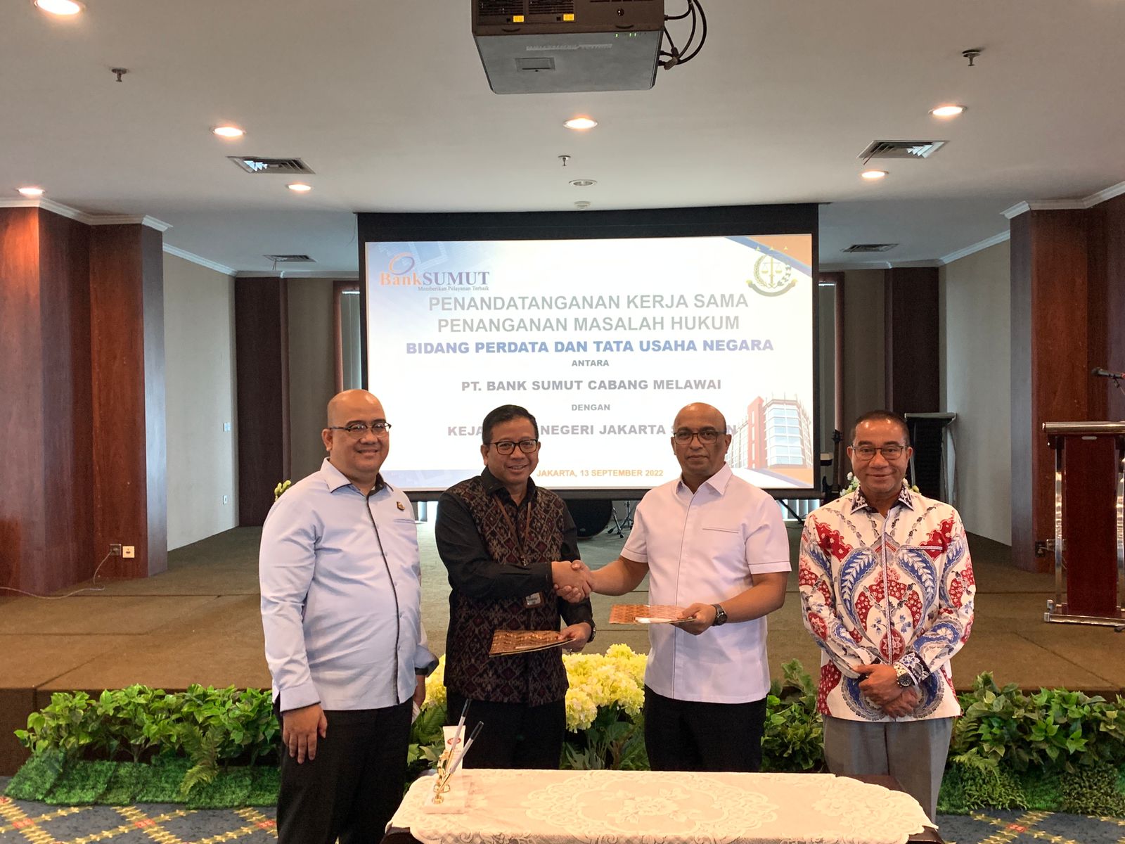 • Pada hari Selasa tanggal 13 September 2022, Kejaksaan Negeri Jakarta Selatan melakukan penandatanganan Perjanjian Kerja Sama / Memorandum of Understanding (MoU) dengan PT. Bank Sumut Cabang Melawai dengan Nomor MoU : B-08/M.1.14/GS/09/2022 tentang penanganan masalah hukum Bidang Perdata dan Tata Usaha Negara. Pelaksanaan penandatanganan Perjanjian Kerjasama tersebut berlangsung di  Aula Kantor Kejaksaan Negeri Jakarta Selatan oleh Kepala Kejaksaan Negeri Jakarta Selatan, Bapak Syarief Sulaeman Nahdi, SH.,MH., dan Bapak Agus Condro Wibowo selaku Pimpinan Cabang PT. Bank Sumut Cabang Melawai. Penandatanganan Perjanjian Kerjasama di Bidang Perdata dan Tata Usaha Negara tersebut meliputi Bantuan Hukum, Pertimbangan Hukum, dan Tindakan Hukum Lainnya yang dihadapi oleh PT. Bank Sumut Cabang Melawai, baik didalam maupun diluar pengadilan.  Kegiatan penandatanganan MoU tersebut juga dihadiri oleh Kepala Seksi Perdata dan Tata Usaha Negara Kejaksaan Negeri Jakarta Selatan, Bapak Prinuka Arrom, SH.,MH., didampingi oleh sejumlah Jaksa Pengacara Negara, para pegawai Kejaksaan Negeri Jakarta Selatan, Direktur Utama PT. Bank Sumut Cabang Melawai, Bapak Rahmat Fadillah Pohan, serta seluruh Jajaran PT. Bank Sumut Cabang Melawai.